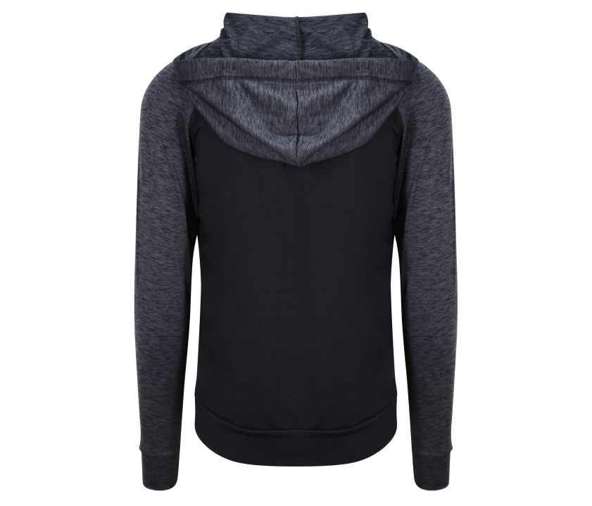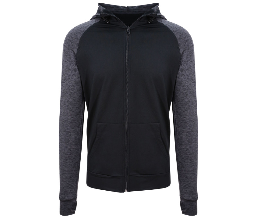 Raglanärmel in Kontrastfarben. Sportliche Passform. Im Rücken abgerundeter Saum. Schnell trocknend. Verstellbare Kapuze. Kängurutasche. Durchgehender Reißverschluss. Daumenlöcher.
