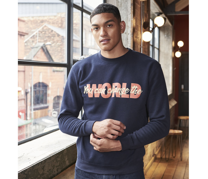 Rundhals-Sweatshirt. Gerade Ärmel. Moderne Passform. Innen gebürstet. Ablösbares Etikett. Doppelnaht. Rippenbündchen an Kragen, Bund und Ärmeln. Weiche Oberfläche für ein optimales Printergebnis. Werk und Garn GOTS und GRS zertifiziert.