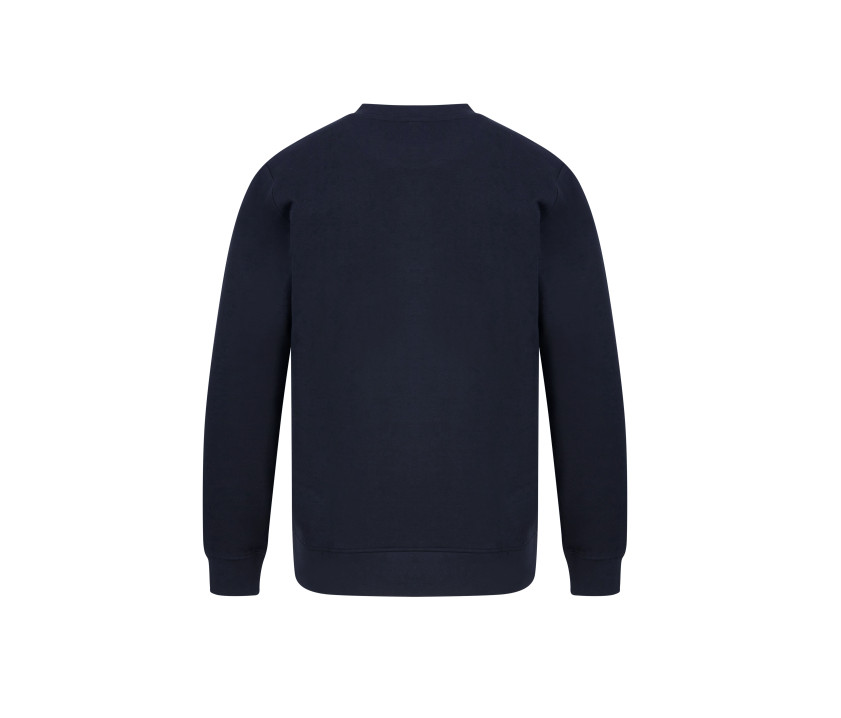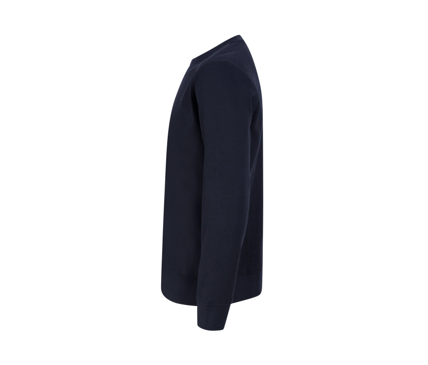 Nach vorne zeigende Schulternähte. Innen angeraut. Rippenbündchen an Ärmelabschlüssen und Bund. Gerade Ärmel. Klassische Passform. Runder Halsausschnitt mit geripptem V-Einsatz.