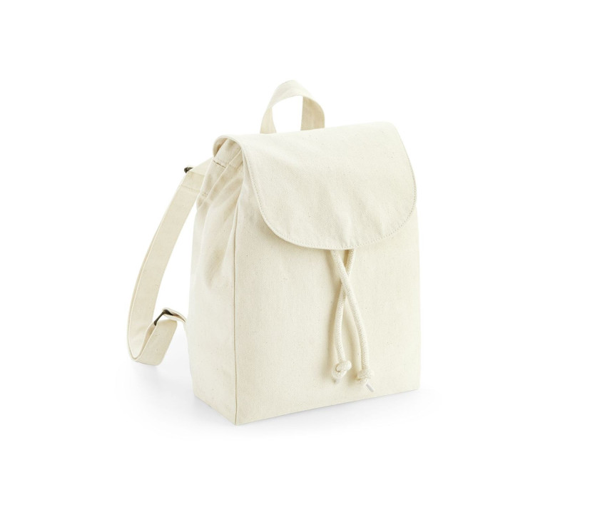 Mini-Rucksack aus Bio-Baumwolle - Klappe mit Druckknopf. Kordelverschluss. Tragegriff.