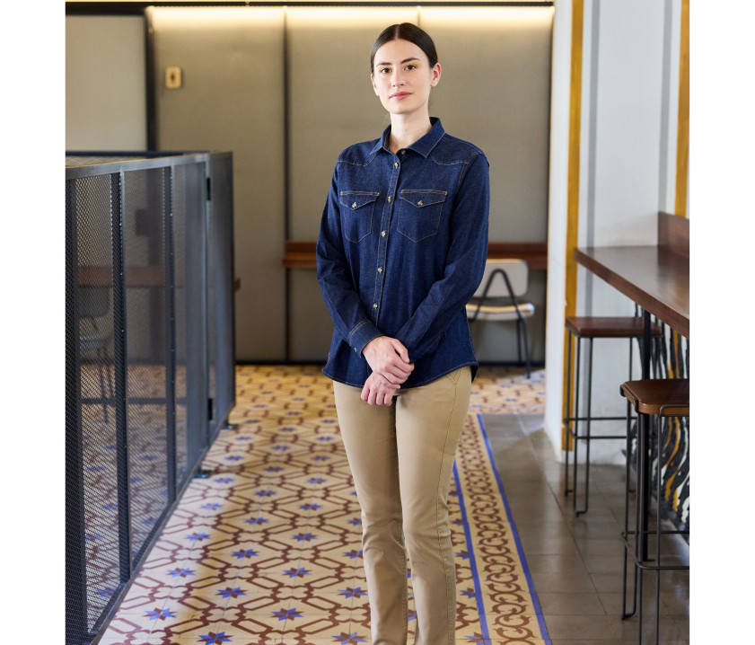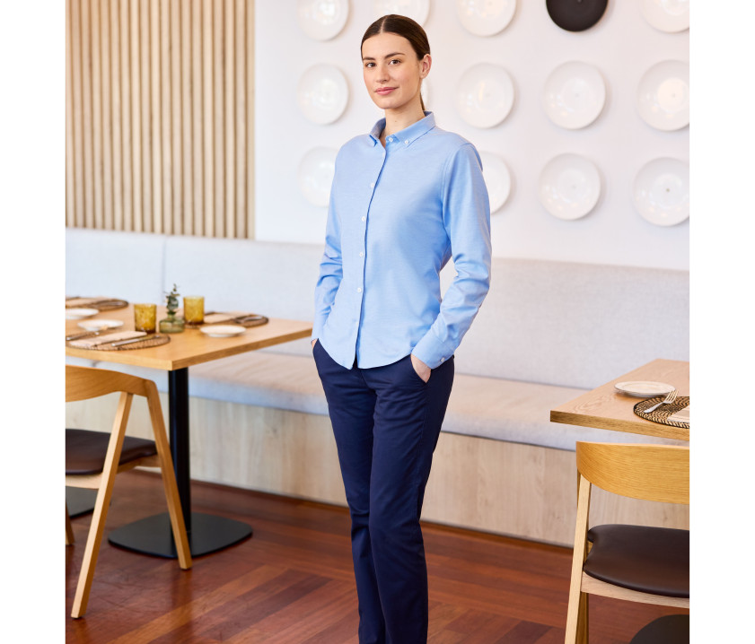Chino-stretch-hose für damen - Zentraler Reißverschluss mit Knopf. Klemmen auf der Rückseite. 5 Taschen: 2 Seitentaschen, 1 Uhrentasche und 2 Gesäßtaschen mit Knopf.