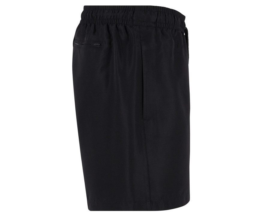 Elastischer Bund mit Kordel. Rückentasche mit Reißverschluss. 2 seitliche Taschen.