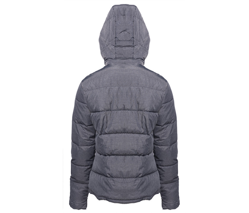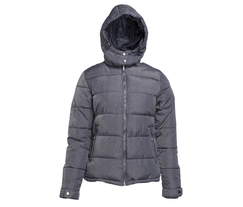 Damen-Steppjacke meliert - Abnehmbare Kapuze. 2 Reißverschlusstaschen an den Seiten und 2 Innentaschen (1 mit Reißverschluss und 1 mit Klettverschluss). Anschluss Markierung am Rücken.
