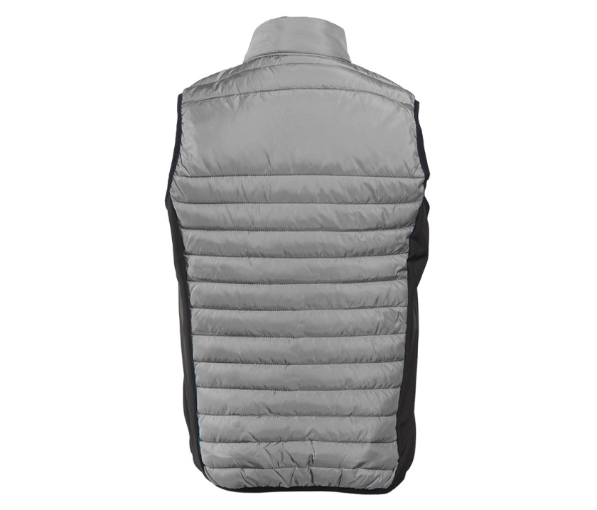 Leichter, modischer Bodywarmer aus Bi-Material. 2 Seitentaschen mit Reißverschluss. Kinnschutz. Kontrastierte Reißverschlüsse. Druckfläche vorne 9 cm und hinten 12 cm.