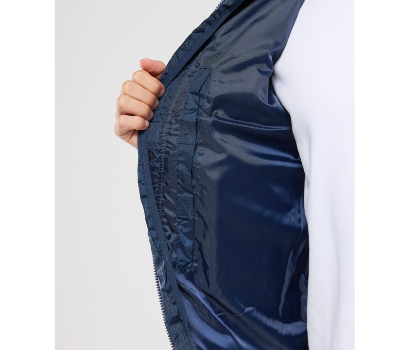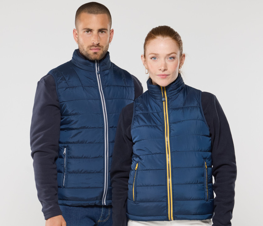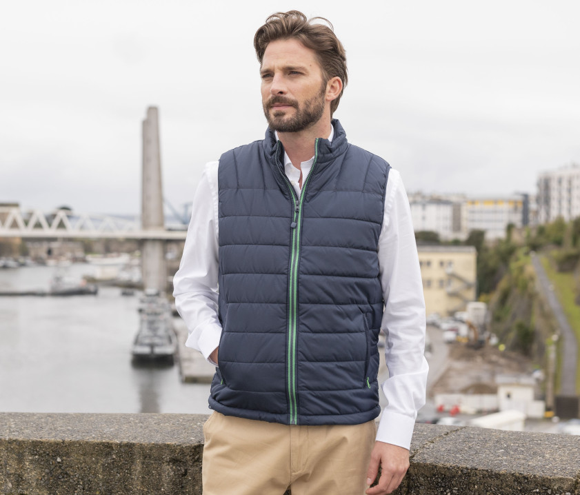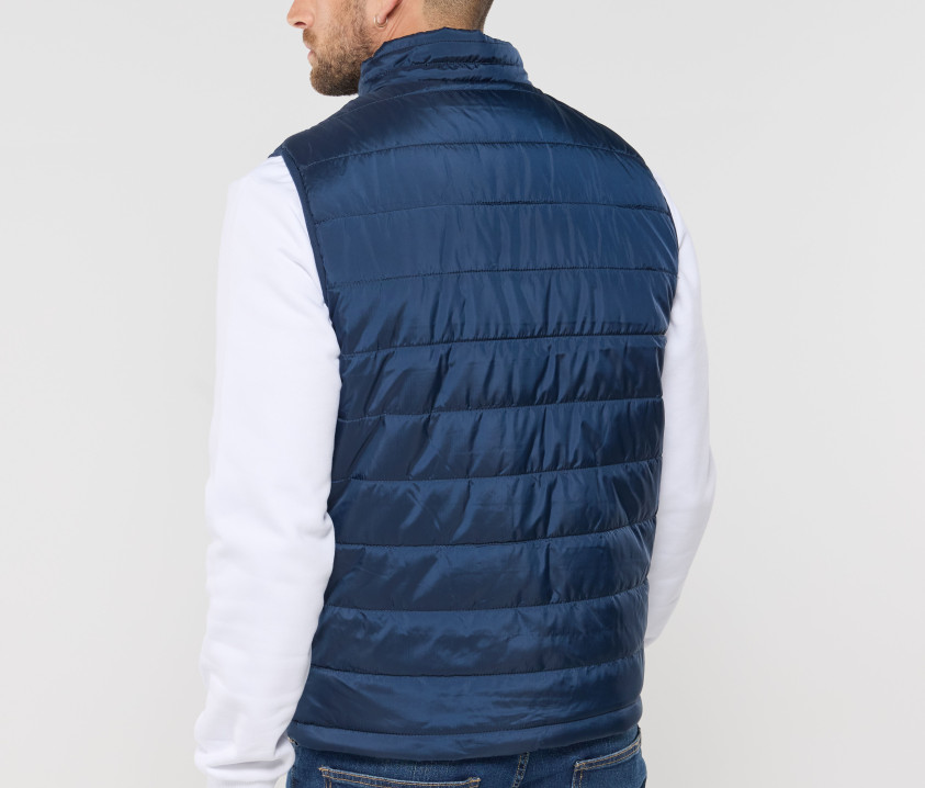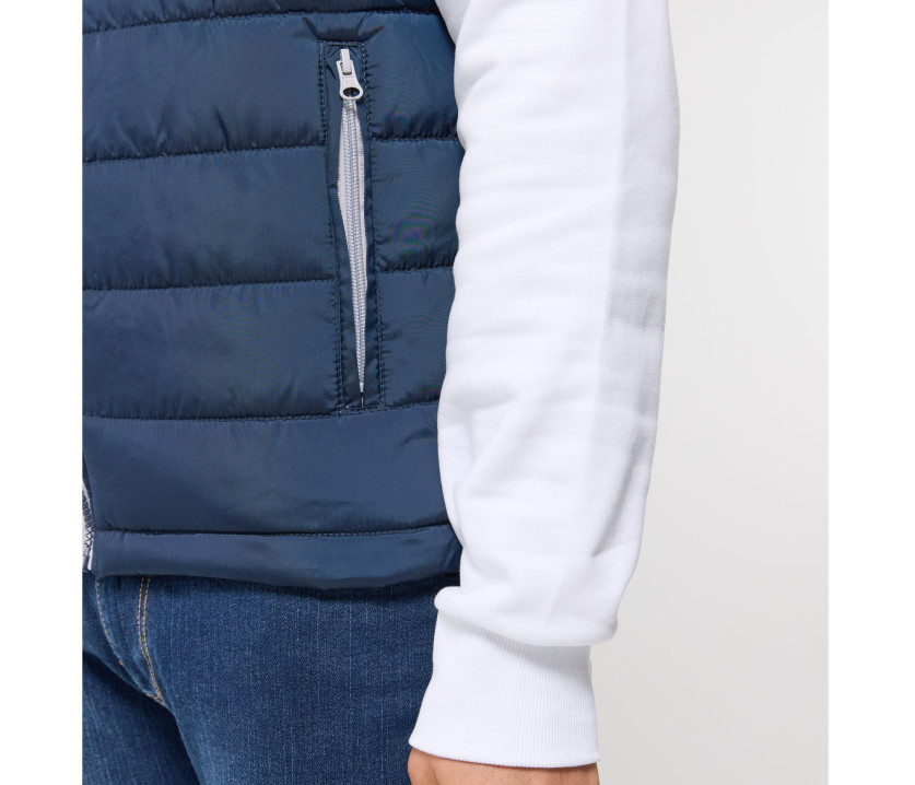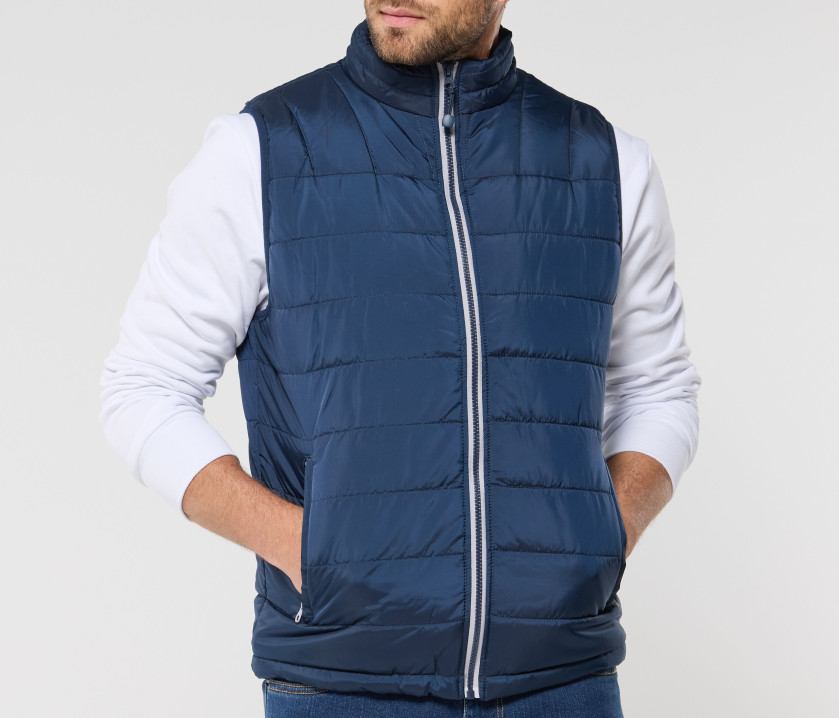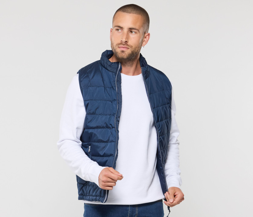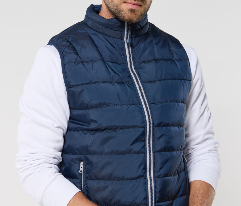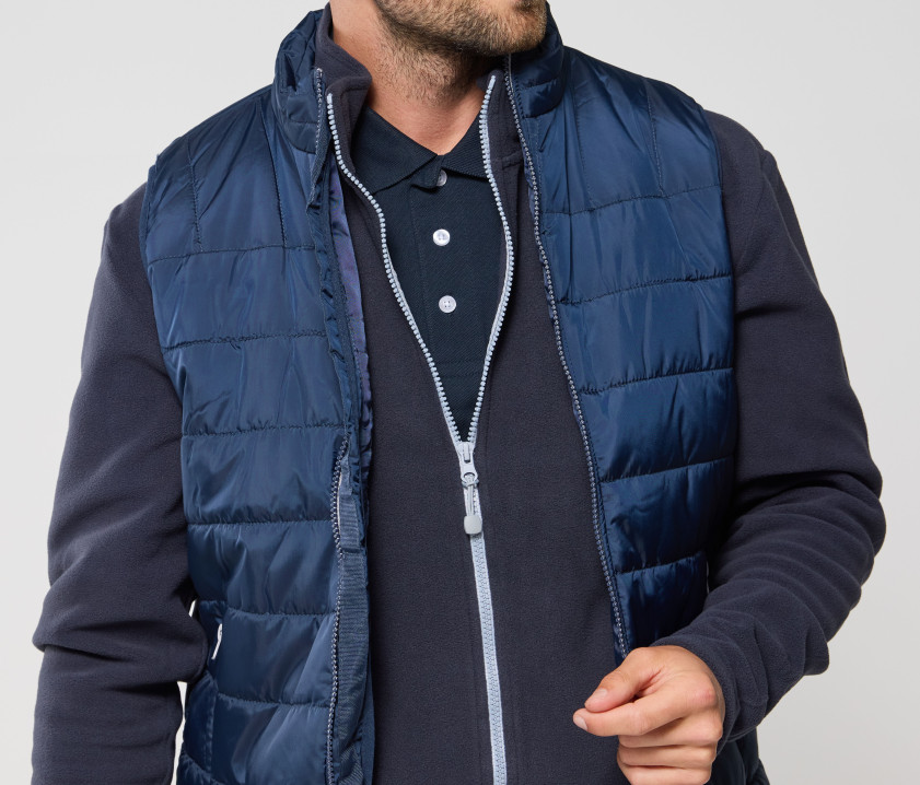 Modischer Bodywarmer für Herren - Großer Reißverschluss mit einer linken Innentasche für Markierungen. Möglichkeit, den Bodywarmer vollständig in der rechten Innentasche mit Velcro®-Klettverschluss zu verstauen. 2 Seitentaschen mit Reißverschluss und Patte.