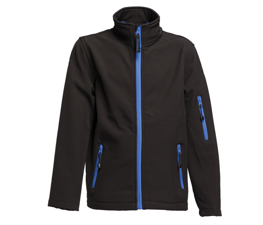 Softshelljacke für Kinder - 3-lagig: atmungsaktiv, wasserdicht, winddicht. Innenschutzklappe unter Reißverschluss und Kinnschutz. 2 Seitentaschen mit Reißverschluss.