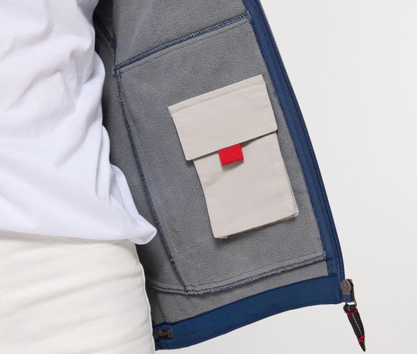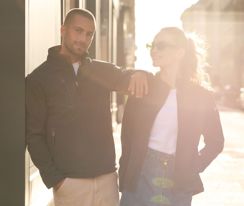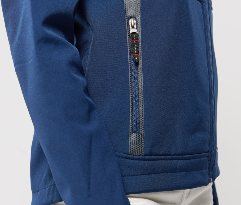 Softshell-Jacke, sehr leicht. 3-schichtiger Stoff mit atmungsaktiver Membran befestigt (800g) und wasserdicht (3000-5000mm). Innenmaterial aus Microfleece. 3 Außentaschen mit Reißverschluss. Gummiband unten mit Stopper. Anliegende Passform. 1 Reißverschlusstasche am Arm. Modell Bodywarmer PK766 Seite 187.