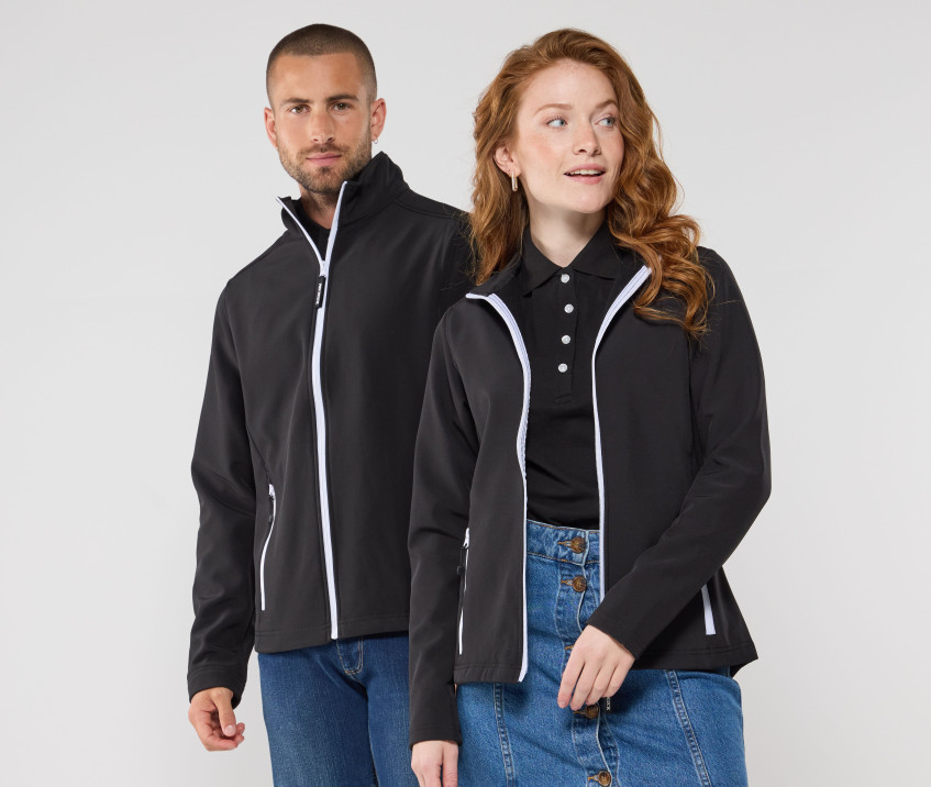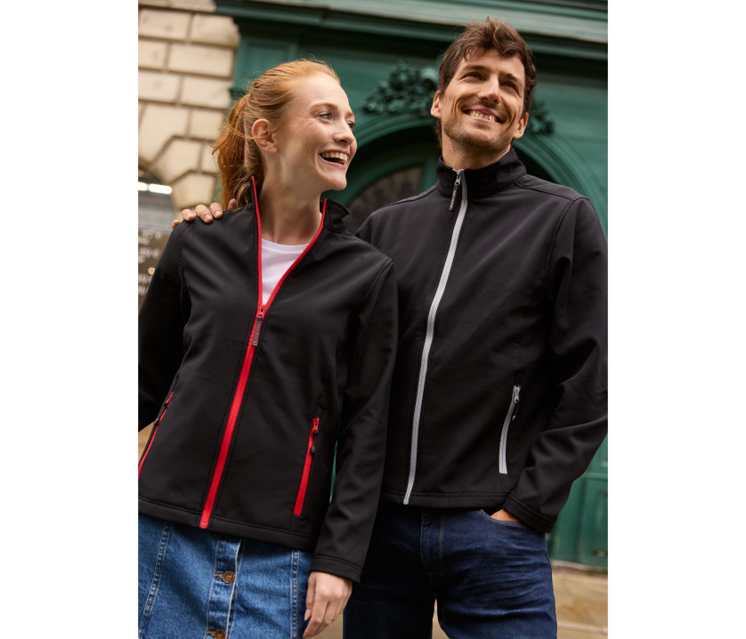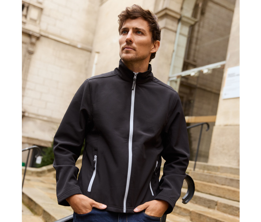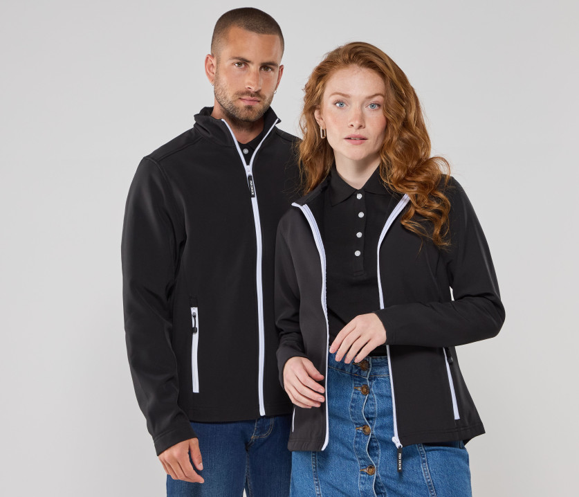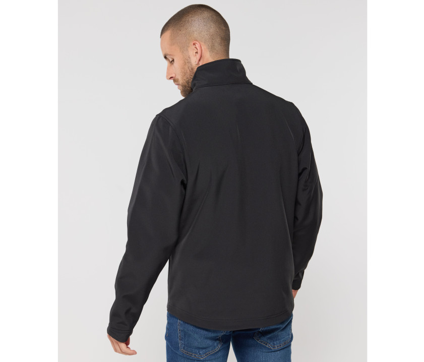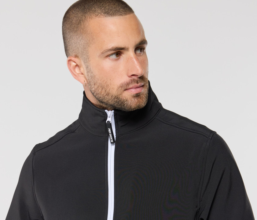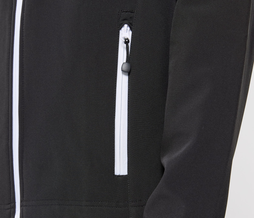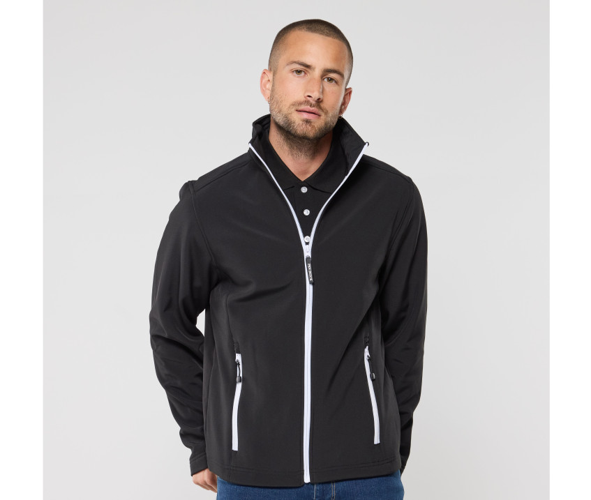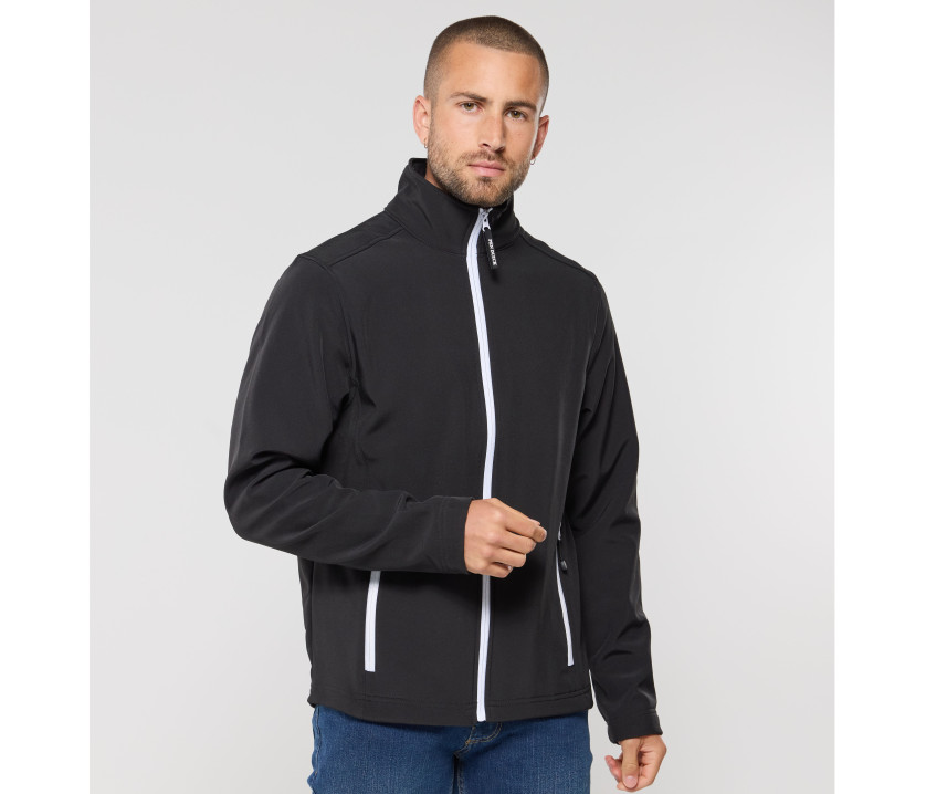 2-lagige Softshell für Herren - Umgekehrter Reißverschluss. Eingesetzte Ärmel. 2 Innentaschen aus Netzgewebe. 2 Taschen mit Reißverschluss an den Seiten. Kinnschutz.