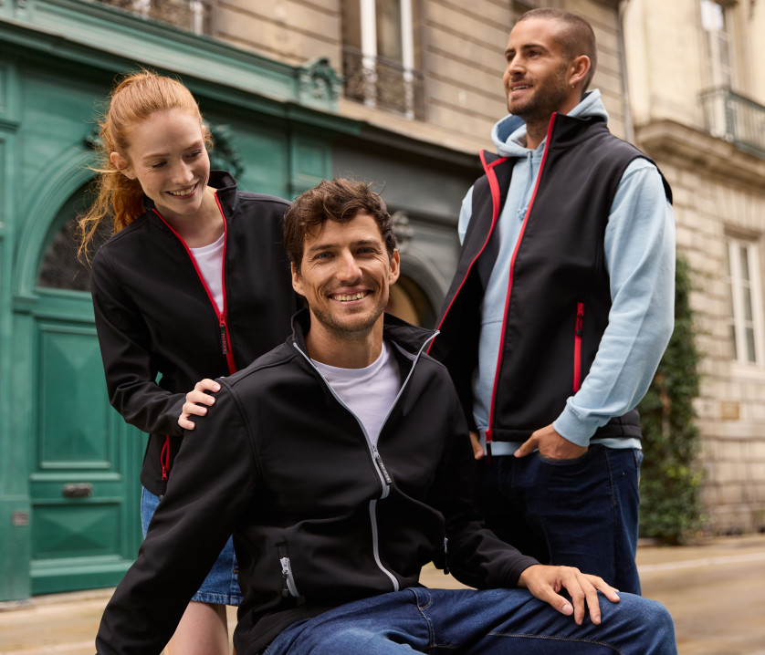 Softshell Herren. Fleece-Futter. Umgekehrter Reißverschluss. Eingesetzte Ärmel. 2 Innentaschen aus Netzgewebe. 2 Taschen mit Reißverschluss an den Seiten. Kinnschutz. Bodywarmer Ref. PK330 Seite 185.