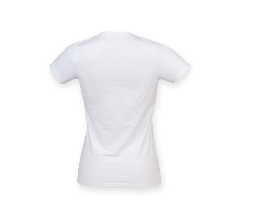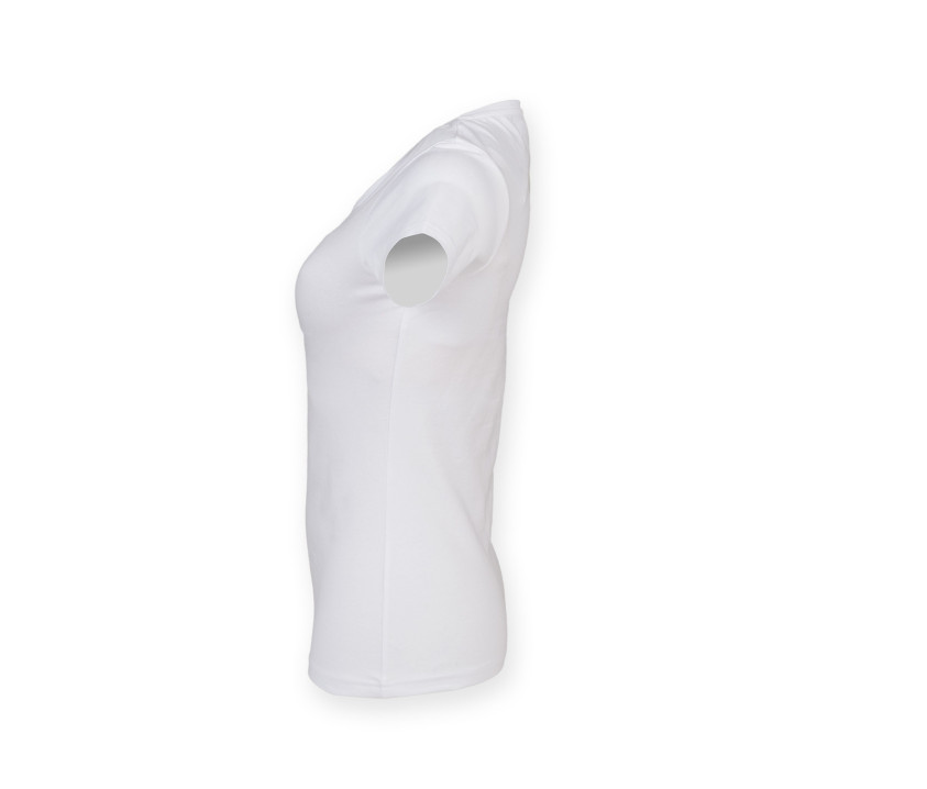 Stretch-T-Shirt mit V-Ausschnitt Damen - Enzymwaschung für den Soft-Touch. Größenangabe am Kragen und abnehmbares Etikett.